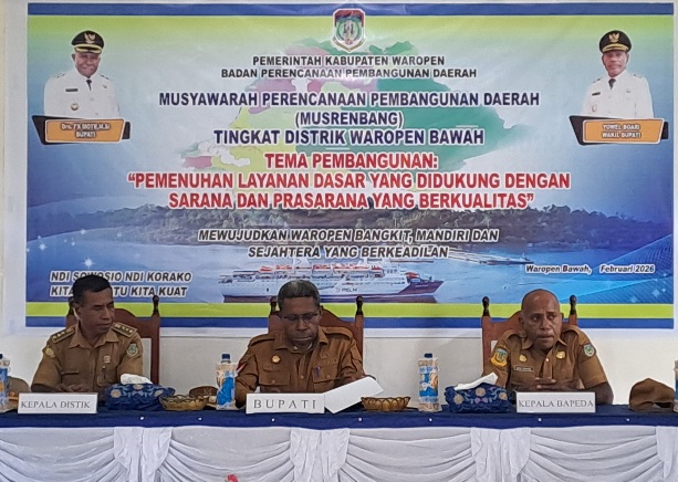 Tengah, Bupati Fransiscus Xaverius Mote; kanan, Plt. Kepala Bappeda Mesak Wonatorei; dan kiri, Plt. Kepala Distrik Waropen Bawah Alfons Wenggi, saat pembukaan Musrenbang tingkat distrik […]