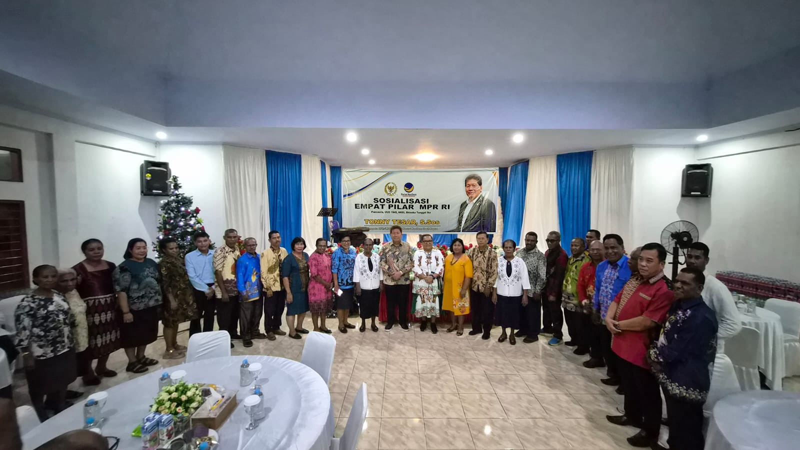 Anggota MPR RI Tonny Tesar berfoto bersama peserta usai kegiatan Sosialisasi Empat Pilar Kebangsaan di Kantor DPW Partai NasDem Kabupaten Jayapura. (Ft: TIM)