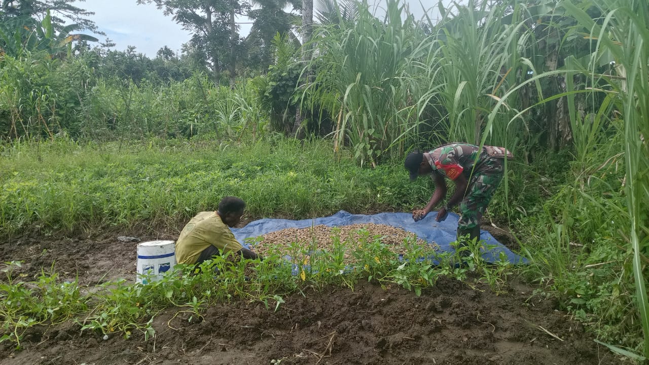 YAPEN | MEPAGO.CO — Wujud kepedulian terhadap warga binaan kembali ditunjukkan oleh Babinsa Koramil 1709-01/Serui, Sertu Musa Yarollo, yang turut membantu salah satu warga binaannya, Bapak Leo Tahoba, dalam kegiatan panen kacang tanah di lahan kebun milik warga tersebut di Kampung Panduami, Distrik Kosiwo, Kabupaten Kepulauan Yapen, Sabtu (1/11/2025).