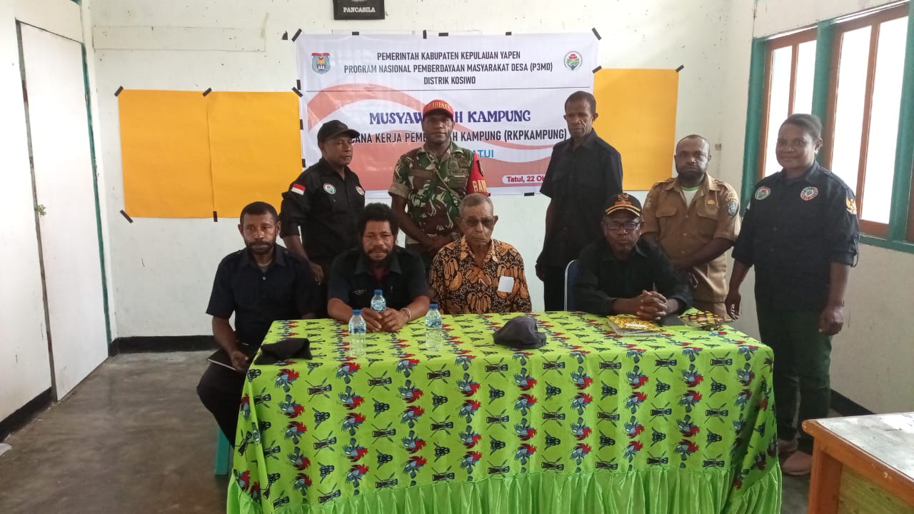 YAPEN | MEPAGO.CO – Babinsa Koramil 1709-01/Serui, Sertu Musa Yarollo, menghadiri rapat Badan Musyawarah Kampung (Bamuskam) Tatui yang digelar di Balai Kampung Tatui, Distrik Kosiwo, Kamis (30/10/2025).