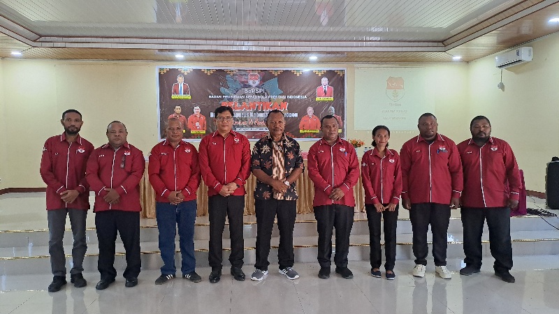 Plt. Asisten II Setda Waropen, Beni Ruatakorei (tengah), bersama Ketua BaPSI Waropen Efraim Yoppi Wambrau, SE, Sekjen BaPSI H. Yudo Hadiyanto, Ketua BaPSI Provinsi Papua Matias Merahabia, dan Sekretaris BaPSI Provinsi Papua Frits B. Moai, berfoto bersama jajaran pengurus BaPSI Kabupaten Waropen usai pelantikan periode 2026–2031. (Tamrin/mepago.co)