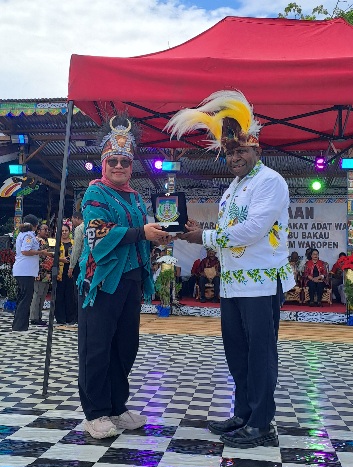 Bupati Waropen Drs. Fransiscus Xaverius Mote, M.Si saat menyerahkan cenderamata kepada Tim Kementerian HAM pada kegiatan resmi di Kabupaten Waropen, sebagai simbol penghargaan dan penguatan sinergi antara pemerintah daerah dan pemerintah pusat. (Ft: Dok/mepago.co)