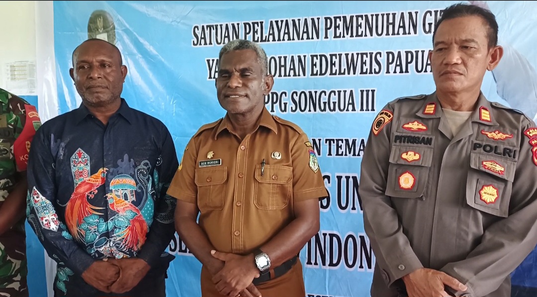 Plh. Sekda Waropen Bob Woriori (tengah) saat diwawancarai wartawan usai meluncurkan Program MBG, didampingi perwakilan Yayasan Johan Edel Weis Papua Alfred Bonay (kiri) serta pejabat Polres Waropen yang mewakili Kapolres. (Ft: IST)