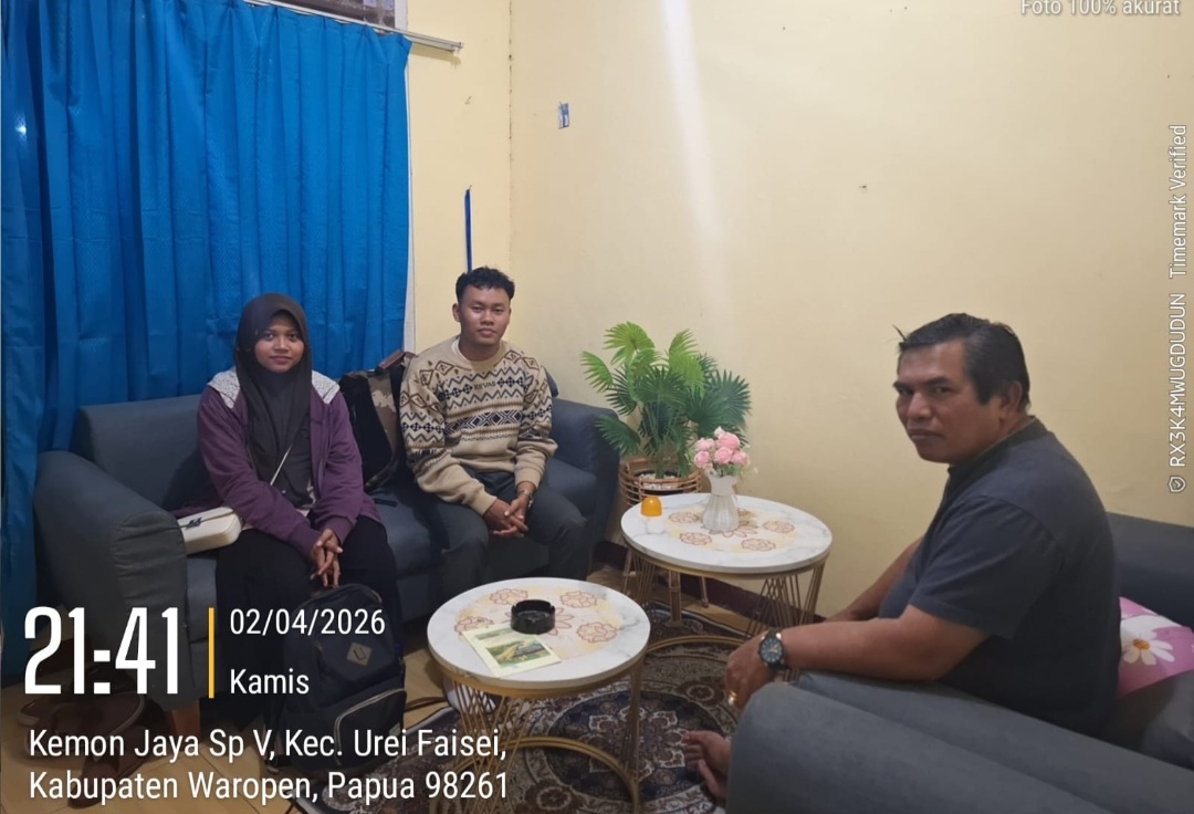 Kepala BPS Waropen berbincang hangat bersama dua staf baru dari BPS Pusat, membangun keakraban dan kesiapan dalam memperkuat kinerja statistik di daerah. (Ft: Dok/Humas BPS)