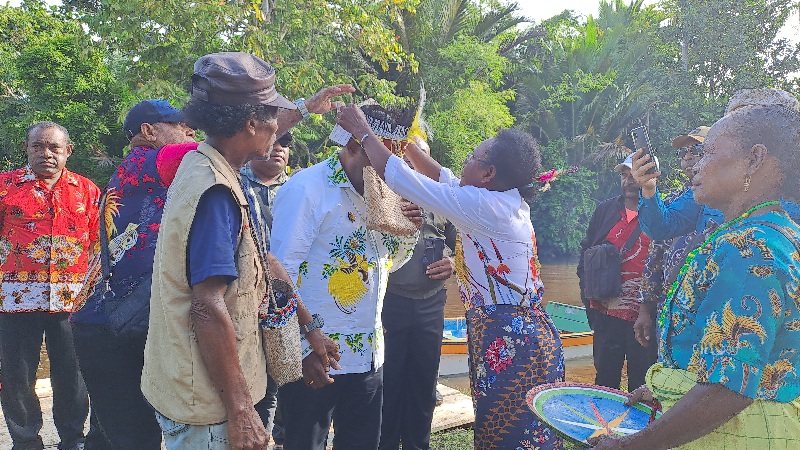 Penganugerahan topi adat sekaligus gelar Sera Hokyh diberikan kepada Bupati F.X Mote oleh tokoh masyarakat Iskandar Rumayomi saat kunjungan kerja di Distrik Soyoi Mambai. (Ft: Tamrin/mepago.co)