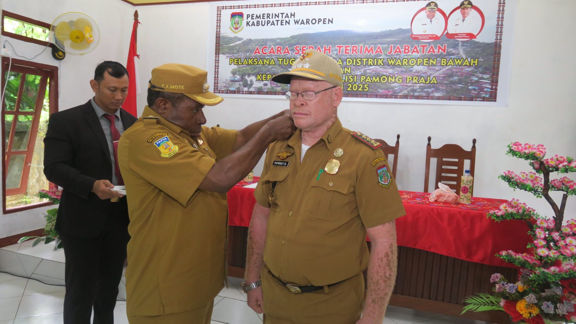 WAROPEN | MEPAGO.CO – Bupati Waropen, Drs. Fransiskus Xaverius Mote, M.Si., memimpin langsung upacara serah terima jabatan (Sertijab) Kepala Distrik Waropen Bawah dan Kepala Satuan Polisi Pamong Praja (Satpol PP) Kabupaten Waropen, yang berlangsung khidmat di Aula Kantor Distrik Waropen Bawah. Kegiatan tersebut juga disertai dengan penyerahan aset sebagai bagian dari proses administrasi pemerintahan.