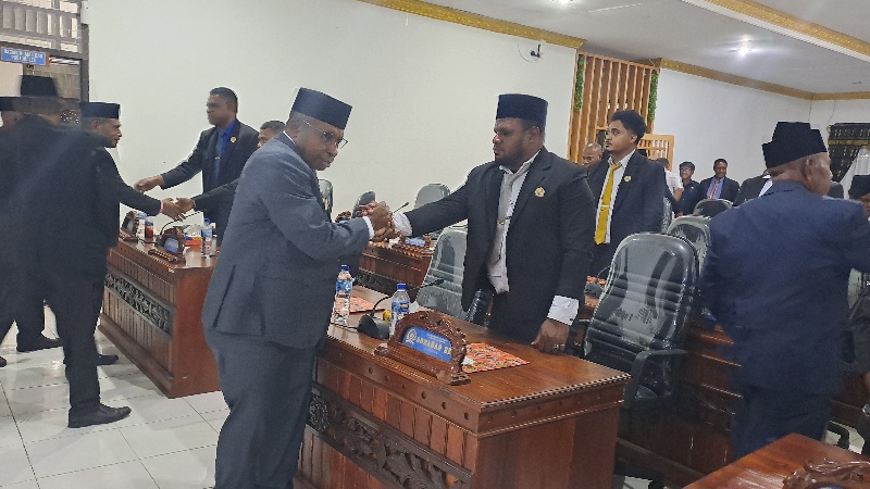 Bupati Waropen, Drs. Fransiscus Xaverius Mote, M.Si, bersalaman dengan Ketua Komisi C DPRK Waropen, Abraham Obi, usai Rapat Paripurna X DPRK Waropen Masa Persidangan III Tahun 2025, Senin (22/12). (Ft: Tamrin/mepago.co)