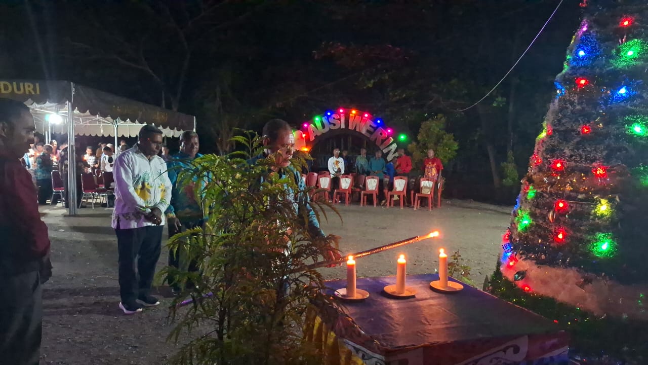 Bupati Waropen Drs. Fransiscus Xaverius Mote, M.Si saat melakukan penyalaan lilin Natal sebagai simbol terang, kasih, dan harapan dalam perayaan Natal. (Ft: TIM)