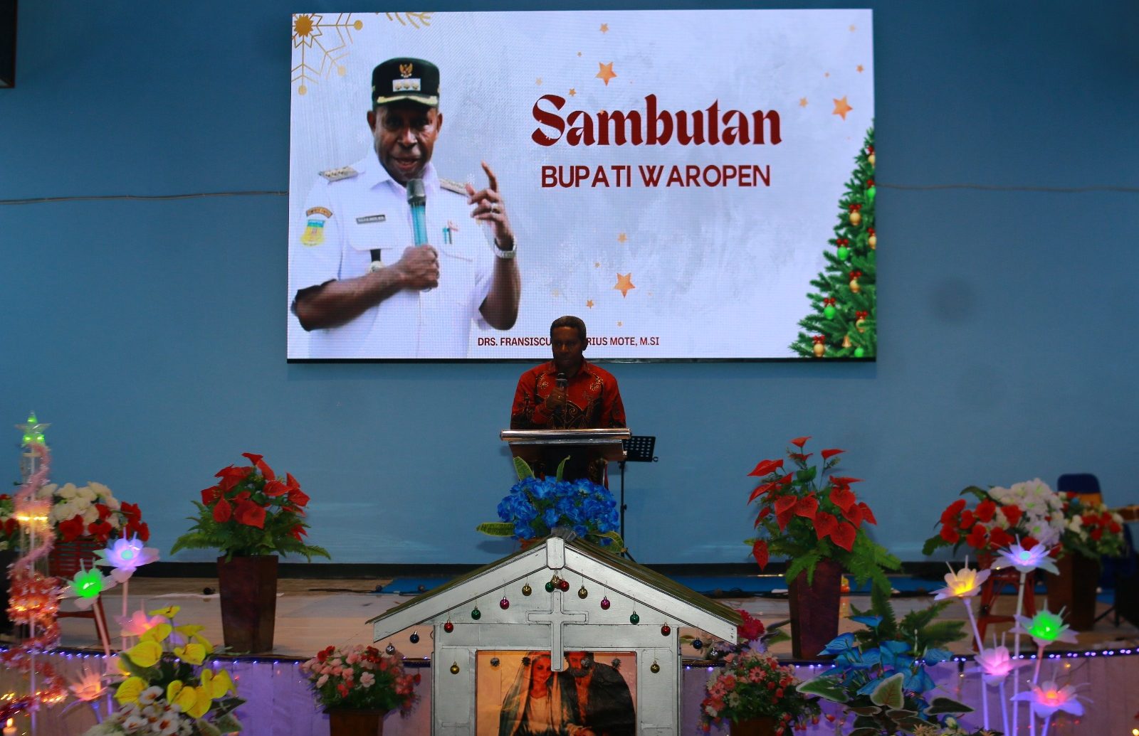 Dalam sambutannya, Bupati Mote mengajak umat Kristen di seluruh Waropen untuk mengosongkan diri menyambut kelahiran Sang Juru Selamat dengan memperbaiki hati, pikiran, perkataan, dan tingkah laku agar mencerminkan Kristus dalam kehidupan sehari-hari.