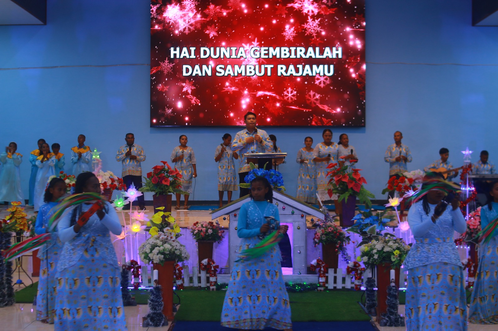 Suasana Ibadah Natal berlangsung khidmat, disertai penyerahan bantuan oleh Bupati Mote kepada Gembala GPdP Alfa Omega Group Waren, Pdt. Yehuda Buinei, yang turut didampingi Ibu Gembala. (Ft: TIM
