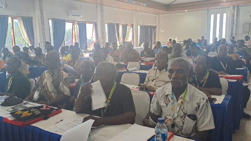 Bupati Mote (tengah) saat memaparkan materi pada Mubes di Aula Klasis GKI Waropen, Jumat 29/11/2025. (Ft: Tamrin/mepago.co)