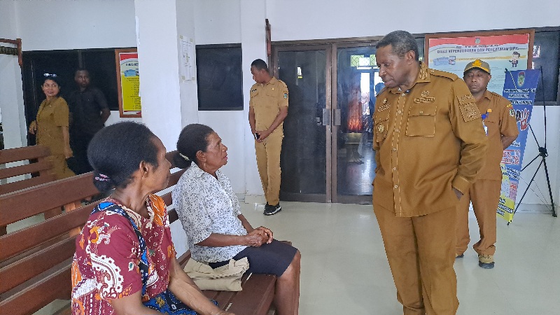 Bupati F.X. Mote saat berbincang dengan mama-mama Waropen ketika mengunjungi Kantor Dinas Kependudukan pada kegiatan sidak pelayanan. (Ft: Dok/mepago.co)