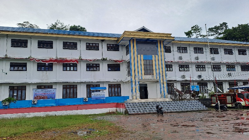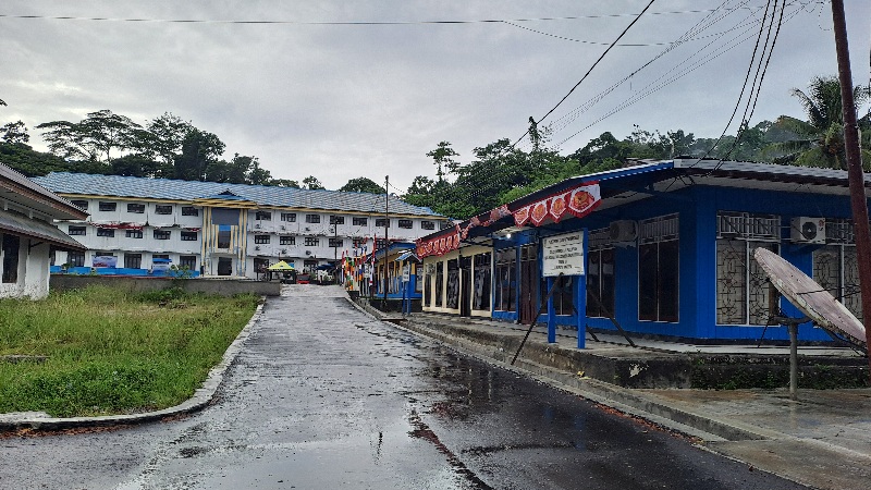 Kantor Bupati Waropen tampak tanpa umbul-umbul di H-1 HUT ke-23, kontras dengan Kantor Koramil Waropen dan Kantor Bappeda di seberang jalan yang sudah dihiasi atribut perayaan. Jarak dekat, semangat berbeda. (Ft: Tamrin/mepago.co)