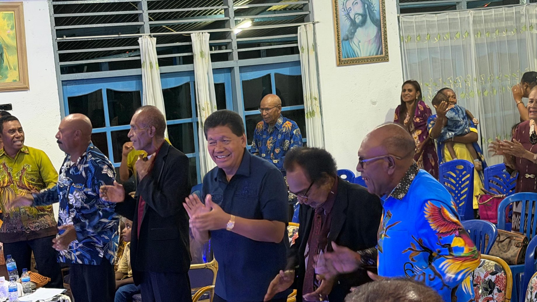Anggota DPR RI Fraksi NasDem, Tonny Tesar, S.Sos, tampak mengenakan kemeja biru lengan pendek saat menghadiri Perayaan Natal Keluarga Besar Aronggear di Jayapura, Kamis (19/12/2025). (Ft: IST)