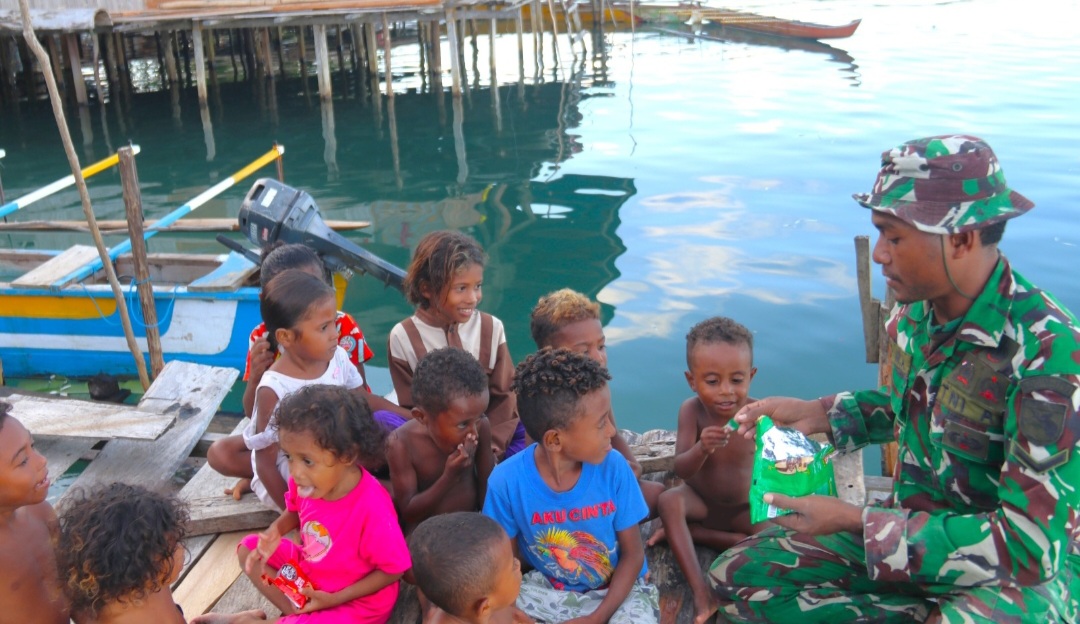 Adalah Serda Ardo Amsamsyum, salah satu personel Satgas TMMD, yang memanfaatkan waktu istirahatnya untuk berkumpul bersama anak-anak kampung.