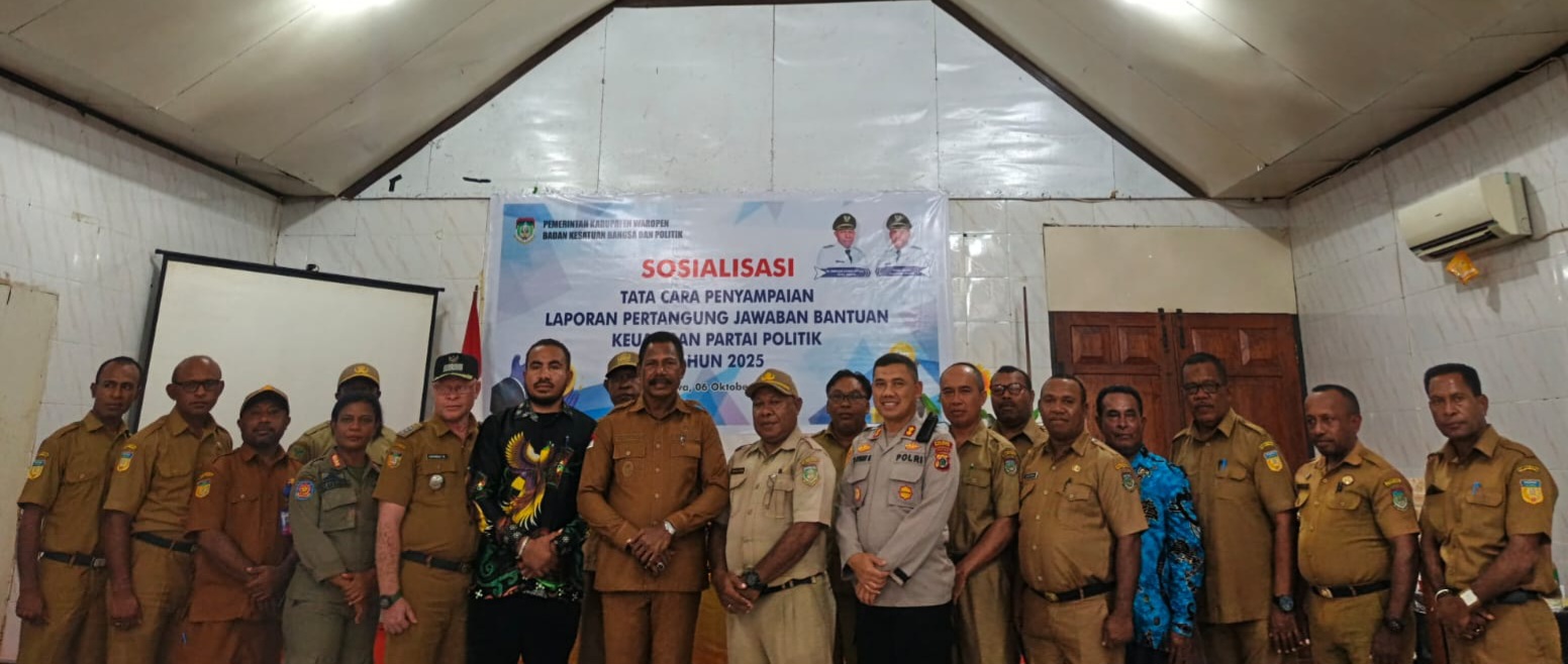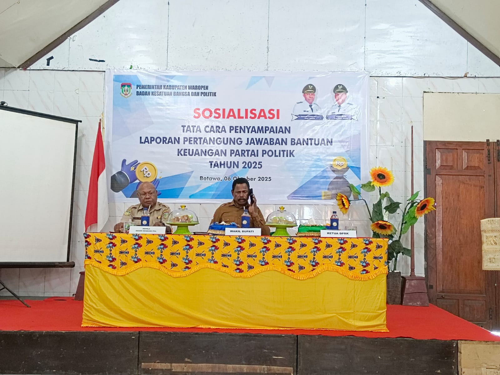 WAROPEN | MEPAGO.CO – Pemerintah Kabupaten Waropen melalui Badan Kesatuan Bangsa dan Politik (Kesbangpol) menggelar Sosialisasi Tata Cara Penyampaian Laporan Pertanggungjawaban (LPJ) Bantuan Keuangan Partai Politik Tahun 2025, yang berlangsung di Aula Hotel Merpati, Senin (6/10/2025) pagi.
