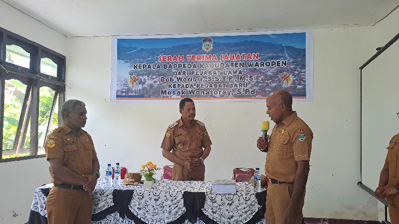 Sementara itu, serah terima jabatan menandai peralihan kepemimpinan dari Bob Woriori kepada Mesak Wonatorey. Sebelum dipercaya memimpin Bappeda, Mesak menjabat sebagai Sekretaris Dewan (Sekwan) DPRK Waropen. Adapun Bob Woriori kini mengemban tugas sebagai Pelaksana Tugas (Plt.) Sekretaris Daerah Kabupaten Waropen.