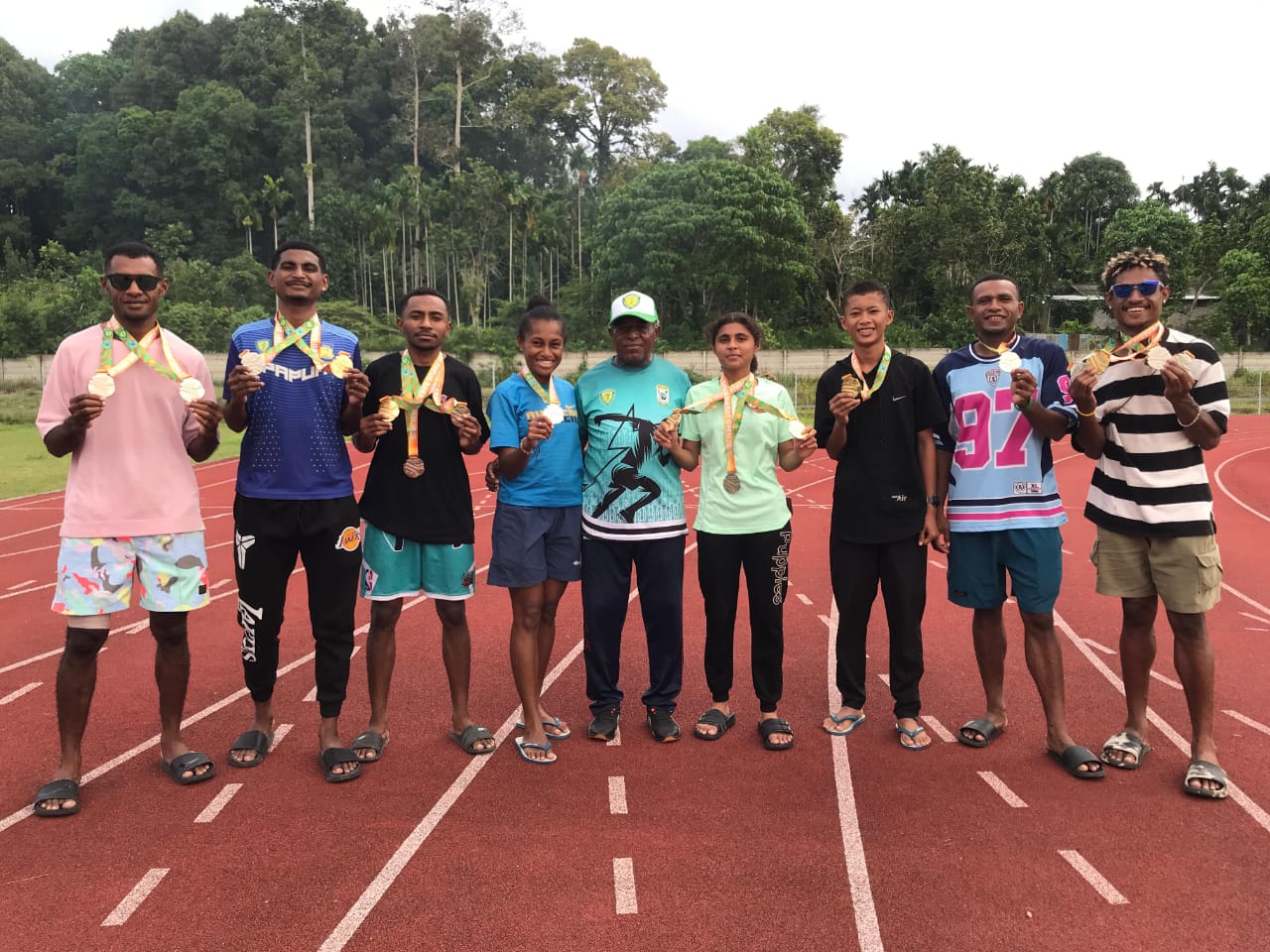 Pelatih kepala Welem Ayomi bersama para atlet PASI Waropen memamerkan medali hasil perjuangan mereka di Kejurprov Atletik Papua Barat 2025. (Ft: IST)