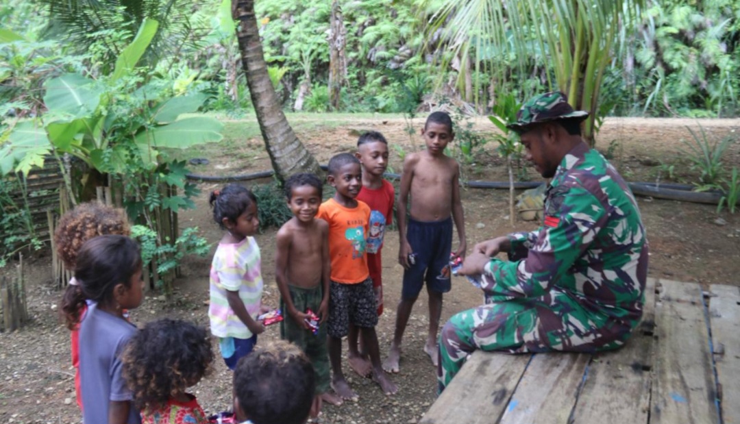 Salah satunya dilakukan Pratu Max Reyaan. Usai mengikuti ibadah bersama warga, ia meluangkan waktu berkumpul dengan anak-anak kampung dan membagikan biskuit serta minuman susu.