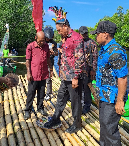 Wakil Bupati Waropen, Yowel Boari, menerima penyematan topi adat dan mengikuti prosesi injak piring setibanya di Kampung Ghoyui/Paradoi, sebelum memasuki lokasi ibadah HUT Pekabaran Injil ke-94 sebagai bentuk penghormatan dan penerimaan secara adat oleh masyarakat setempat. (Ft: Tamrin/mepago.co)