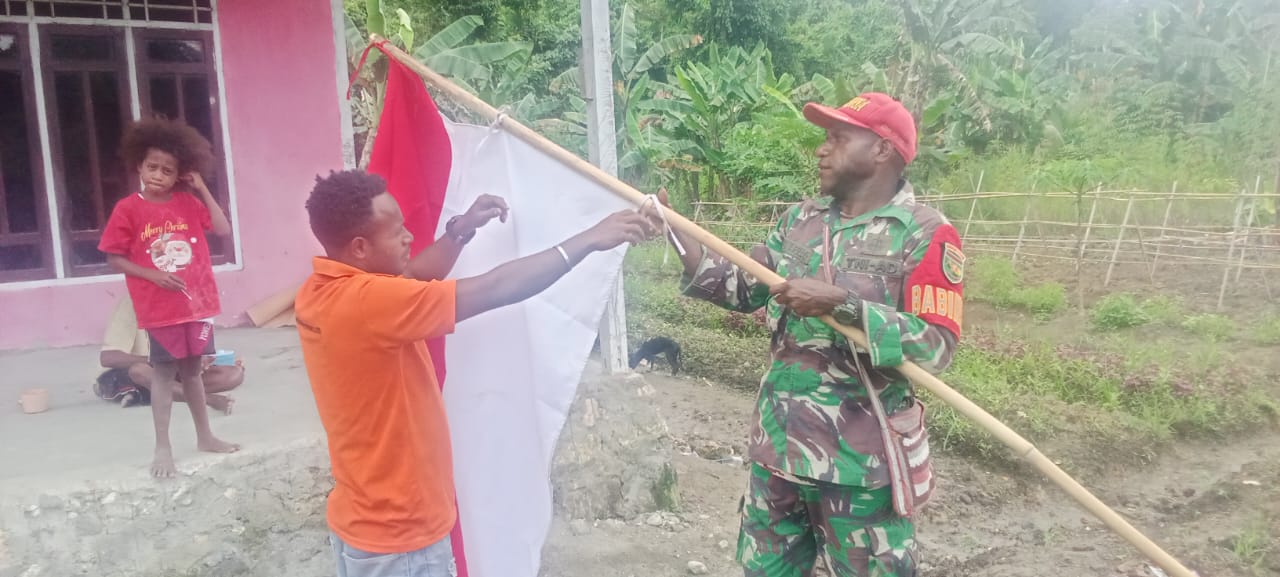 MEPAGO.CO|Yapen – Dalam rangka menyambut Peringatan Hari Kemerdekaan RI ke-79 diwilayah binaannya, Koramil 1709-01/Serui melalui para personel Babinsanya Sertu Musa Yarollo, Kuptu Aan Kurniawan dan Praka Cecep A. Harja, menghimbau dan mengajak seluruh warga untuk melakukan pemasangan Umbul-umbul dan Bendera Merah Putih diwilayah binaannya yang berada diwilayah Distrik Kosiwo, Kabupaten Kepulauan Yapen, Jumat (02/08/2024).