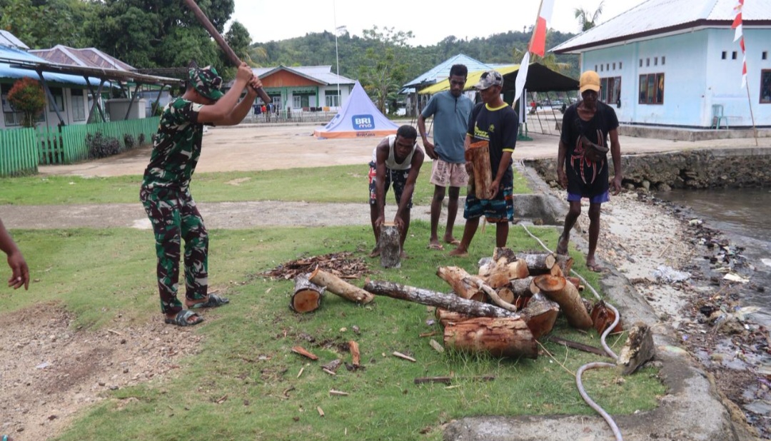 Di sela-sela pembangunan program TNI Manunggal Membangun Desa (TMMD), personel Satgas bersama warga bahu-membahu membelah dan mengumpulkan kayu bakar untuk kebutuhan memasak sehari-hari.