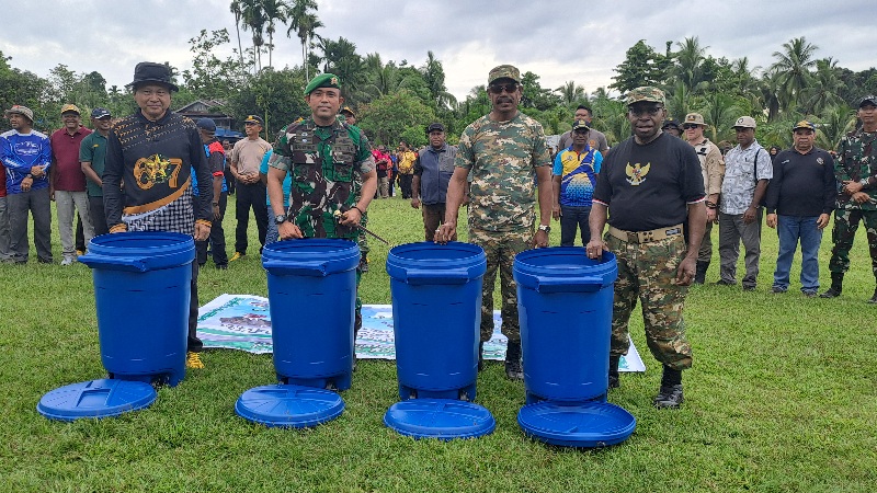 Aksi peduli sampah mendukung lingkungan bersih: Bupati Waropen Fransiscus Xaverius Mote (paling kanan) bersama Wabup Yowel Boari, Danyon NSK/TP Waropen Alfa, dan Wakapolres Waropen Jerry Koagouw saat membuang sampah ke tempatnya usai apel gabungan peringatan Hari Sampah Nasional. (Ft: Tamrin/mepago.co)