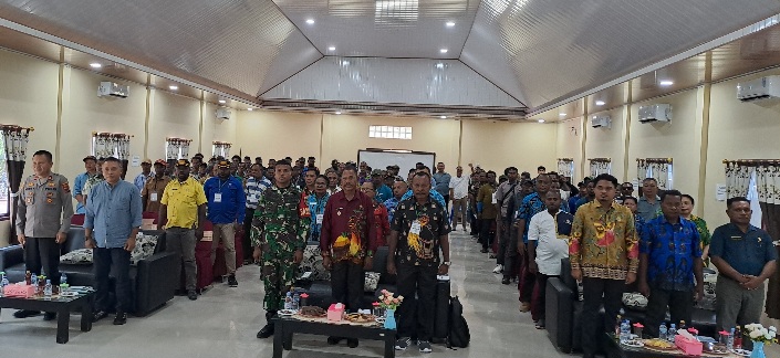 Berfoto bersama usai pembukaan kegiatan konsultasi publik PBPH PT Wana Rimba Nusantara dan PT Lestari Bumi Papua di Kabupaten Waropen. (Ft: Tamrin/mepago.co)