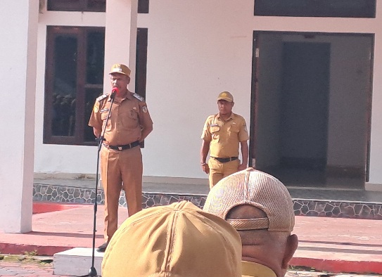 Wakil Bupati Waropen Yowel Boari saat memimpin apel pagi gabungan ASN di halaman Kantor Bupati Waropen. (Ft: Tamrin/mepago.co)