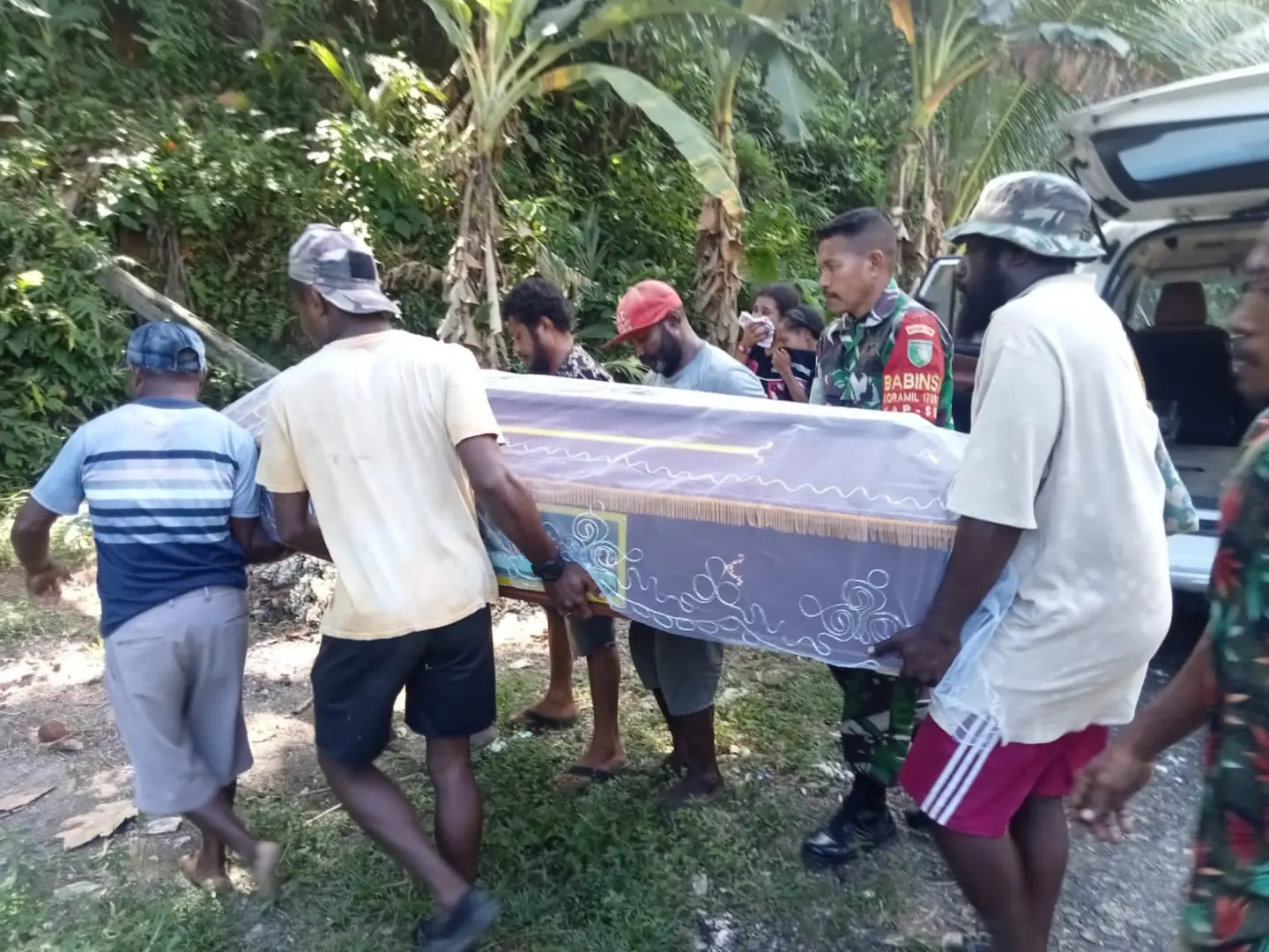 Setelah itu, bersama-sama warga sekitar babinsa pun turut ambil bagian dalam mengangkat peti dari mobil jenazah menuju lokasi pemakaman, kemudian dilanjutkan dengan prosesi ibadah pemakaman dan pengangkatan peti jenazah kedalam liang lahat, yang diakhiri dengan proses pemakaman.