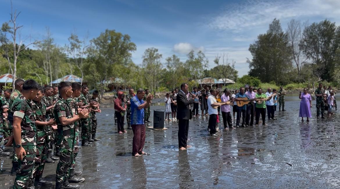 WAROPEN | MEPAGO.CO – Prajurit Yonif TP 860/NSK melaksanakan kegiatan ibadah pembaptisan bersama masyarakat sebagai wujud nyata kepedulian, kebersamaan, serta kemanunggalan TNI dengan rakyat di wilayah Kabupaten Waropen, Provinsi Papua.